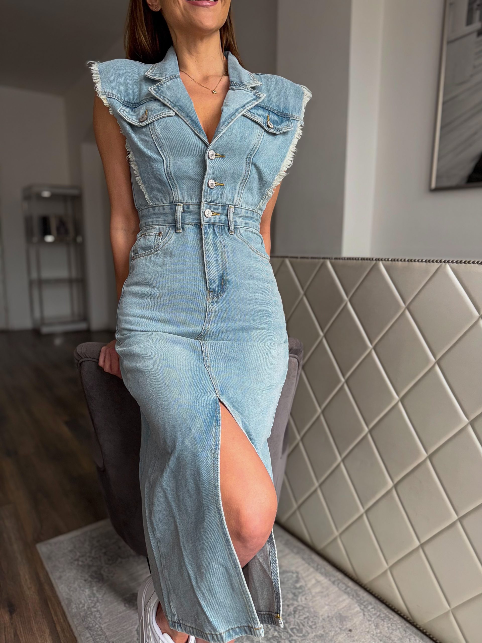 Light blue, sleeveless, midi jeans dress: