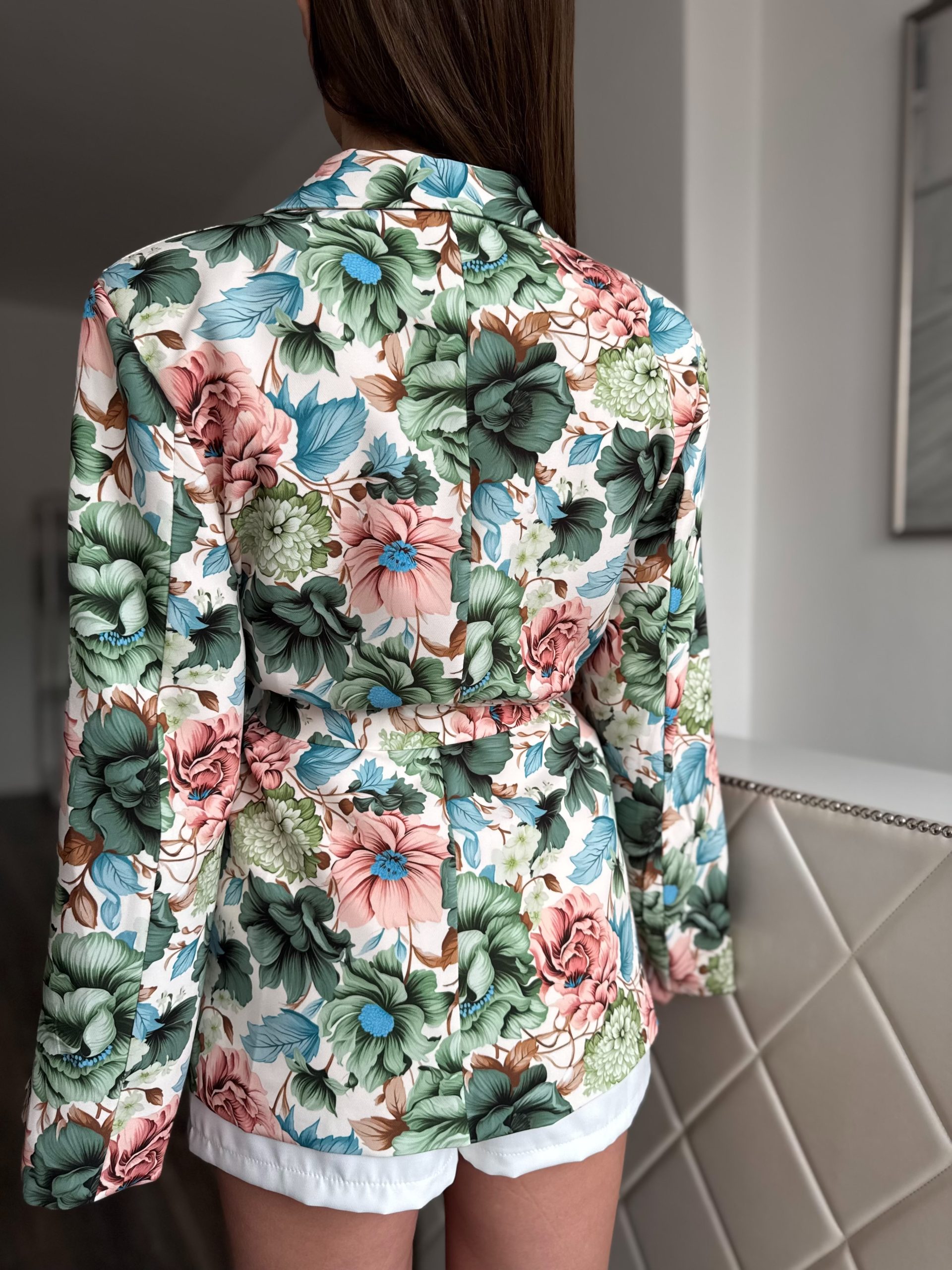 Cream coloured blazer with a colourful floral pattern: