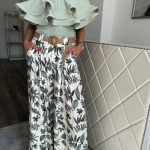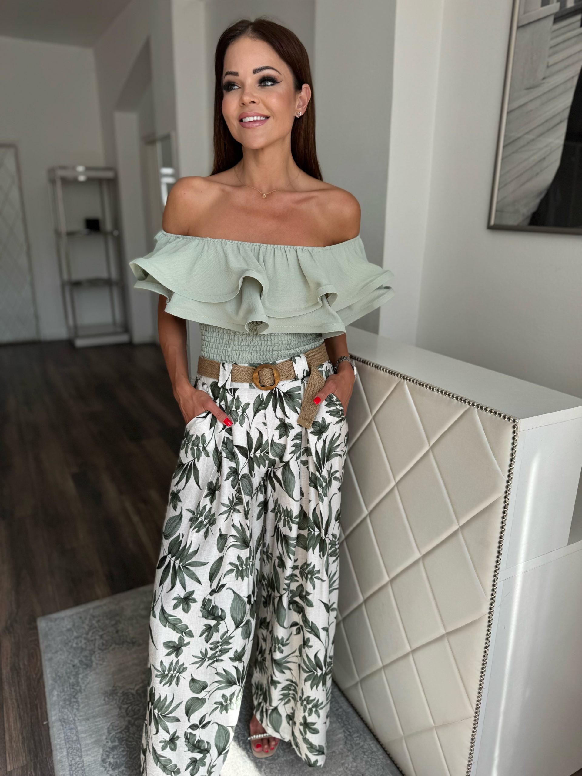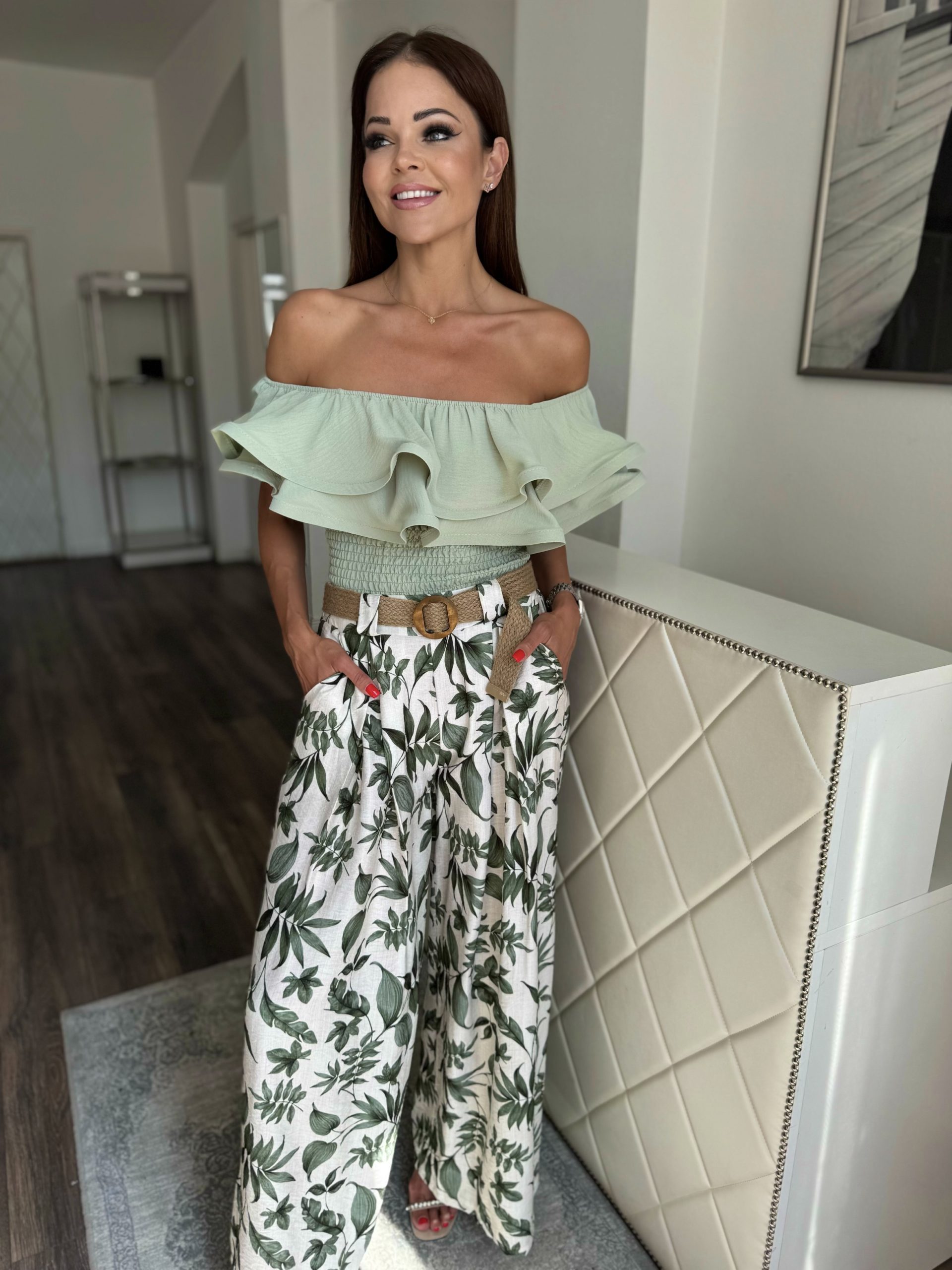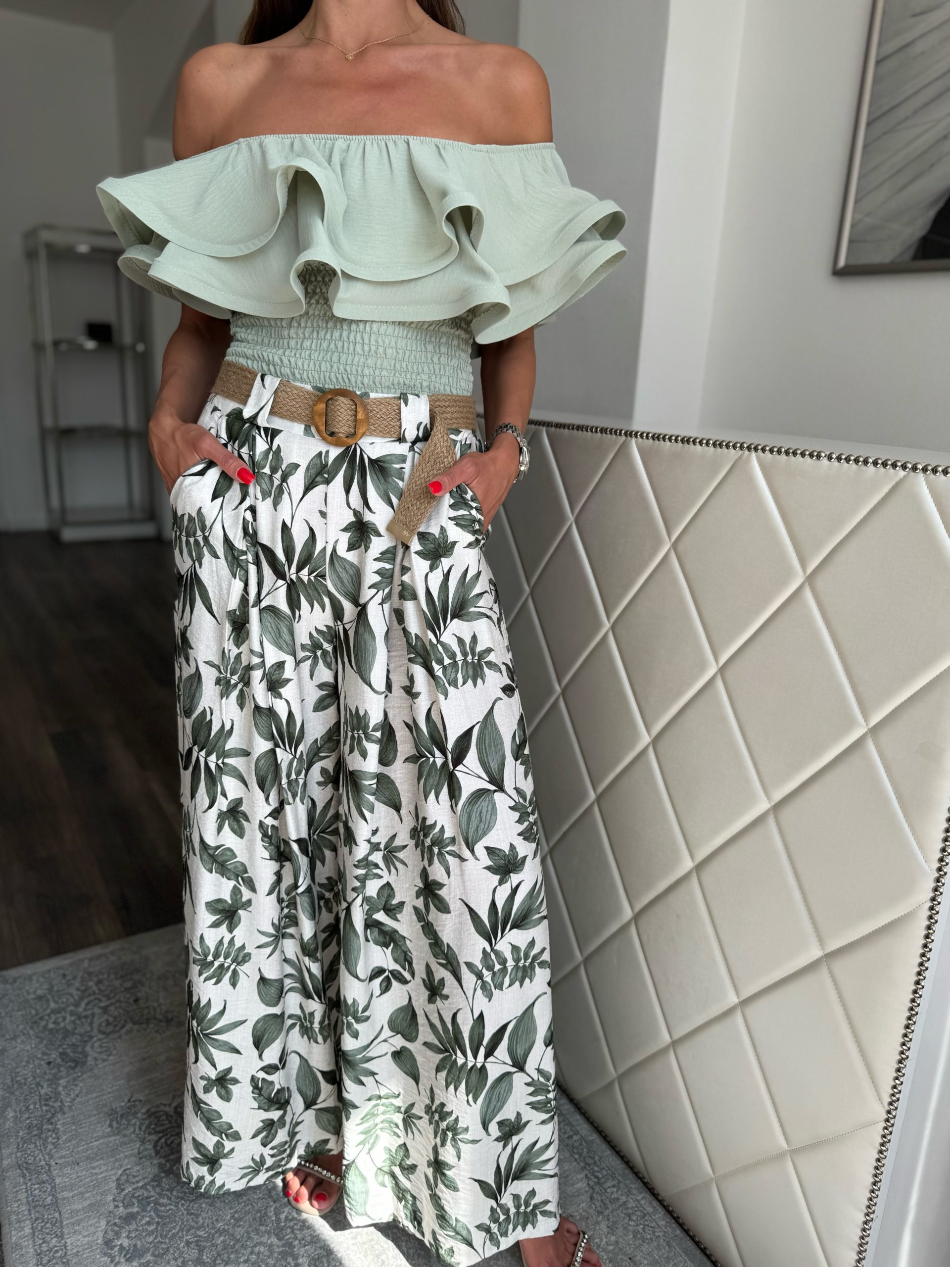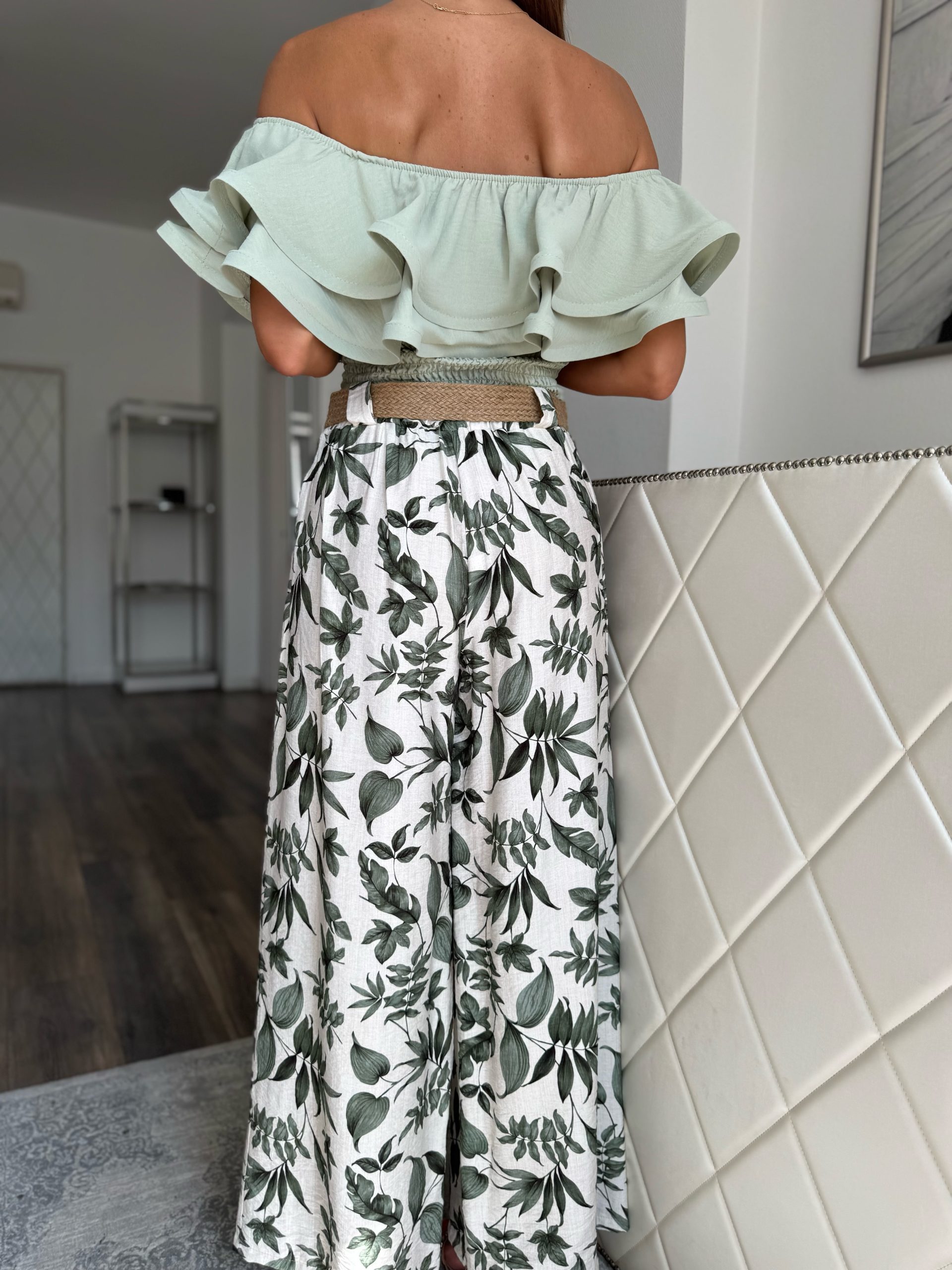 Pale beige trousers with green leaf pattern on a belt:
