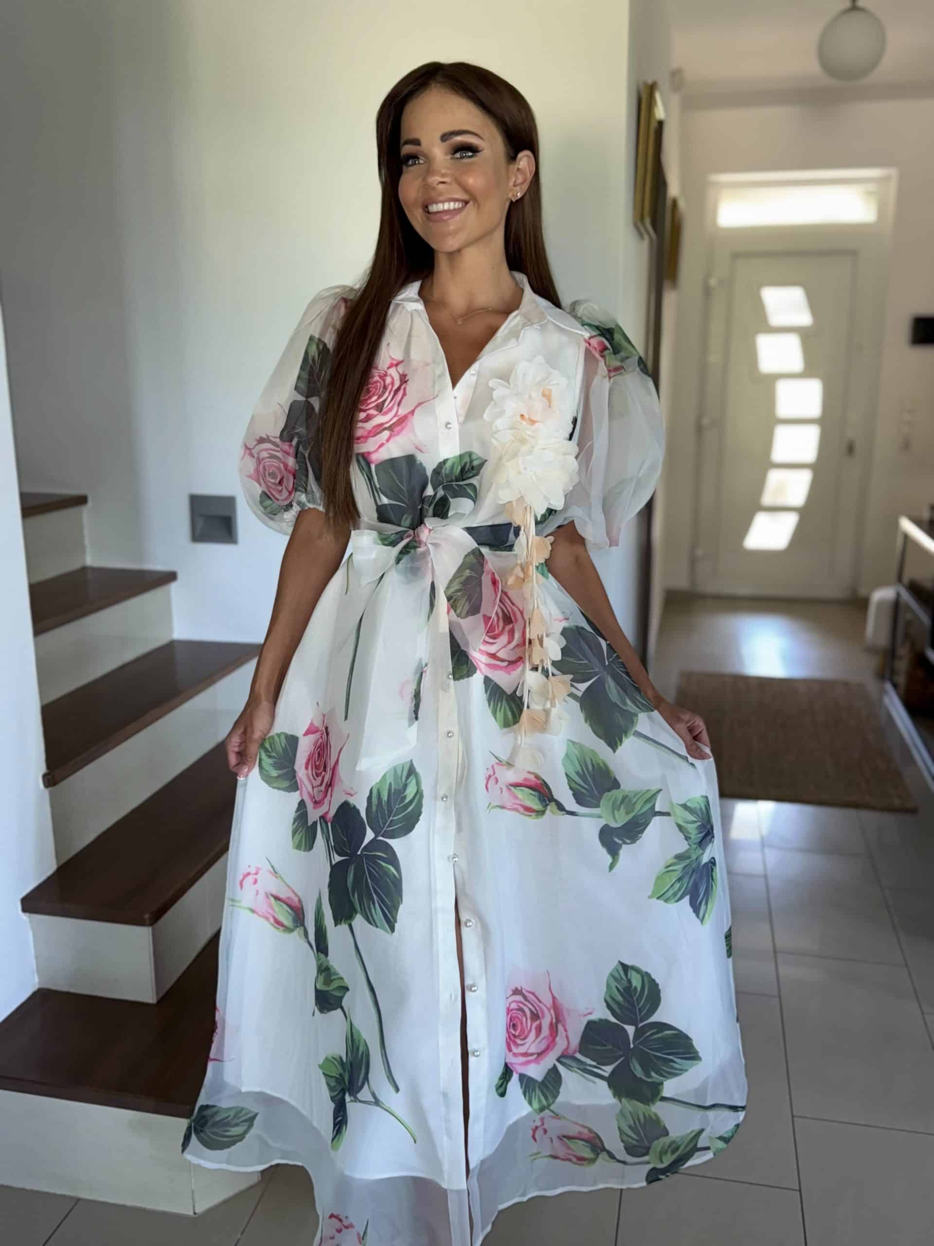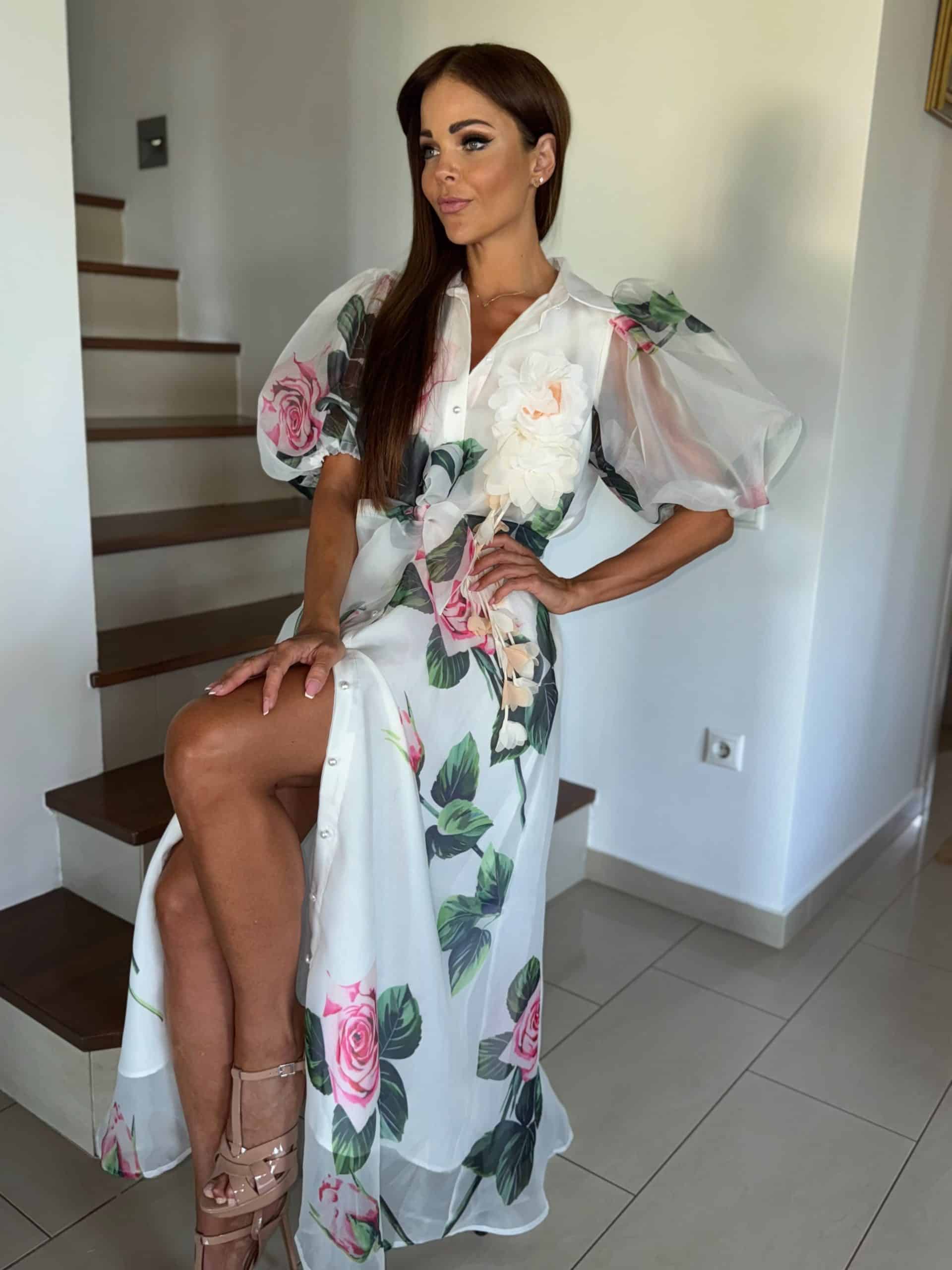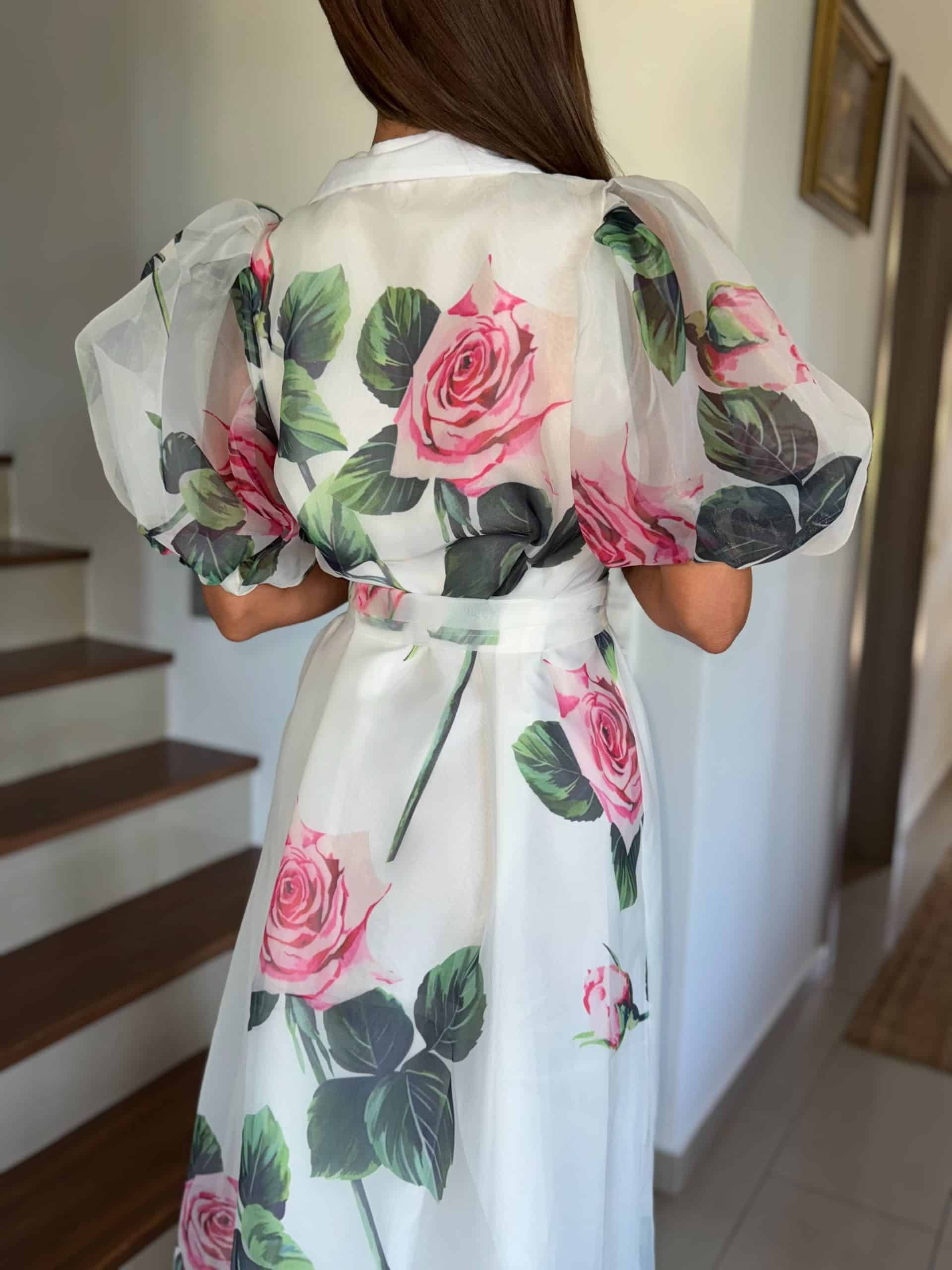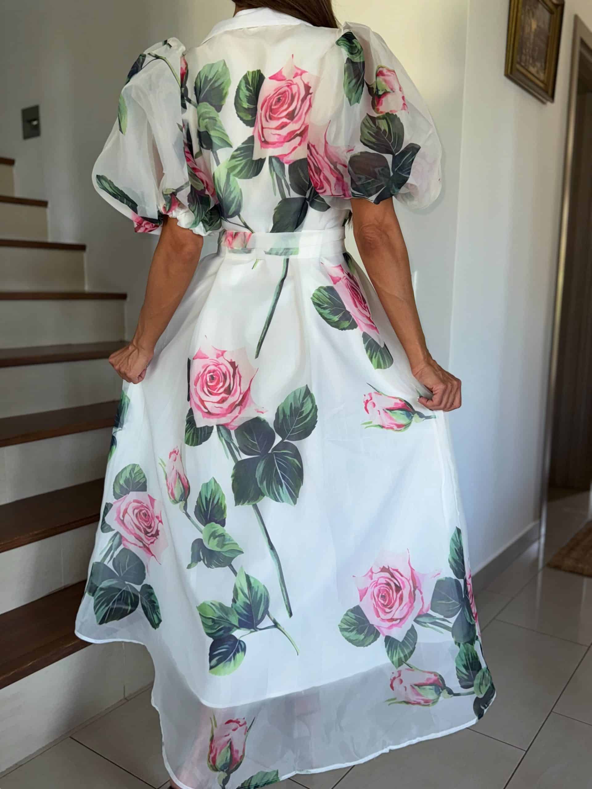 The Eternal Blossom maxi dress is a meeting of romance and sophistication. Its airy, translucent fabric and rosy pattern give it a truly feminine look, while the puff sleeves and buttoned fit add a special character. The classic white base and vibrant roses exude timeless elegance.