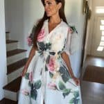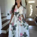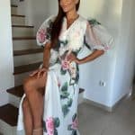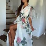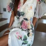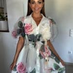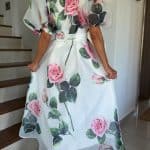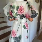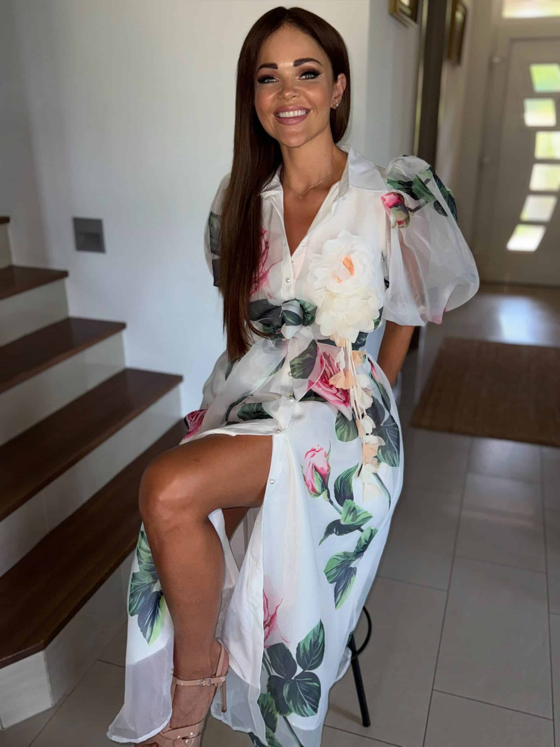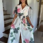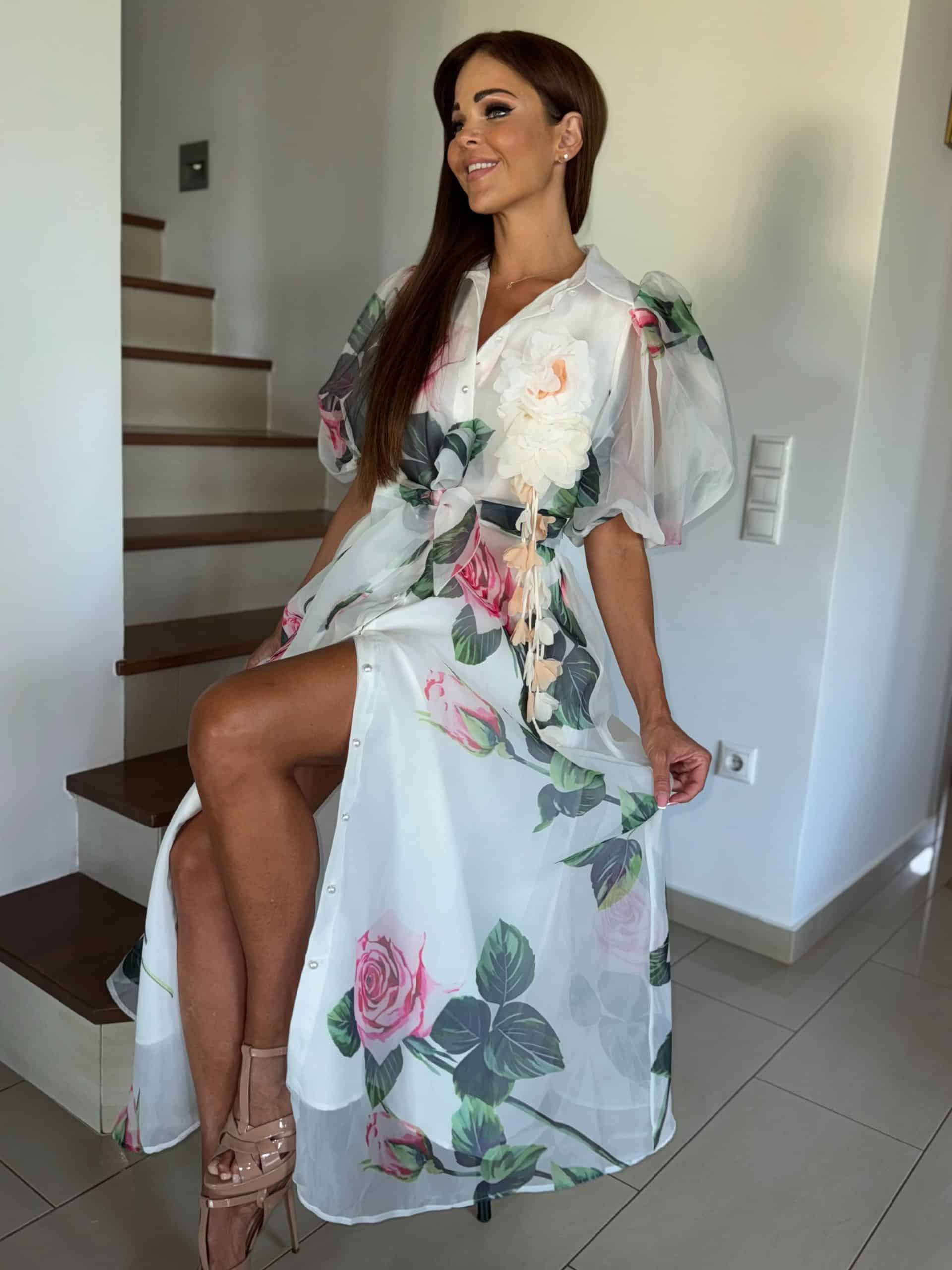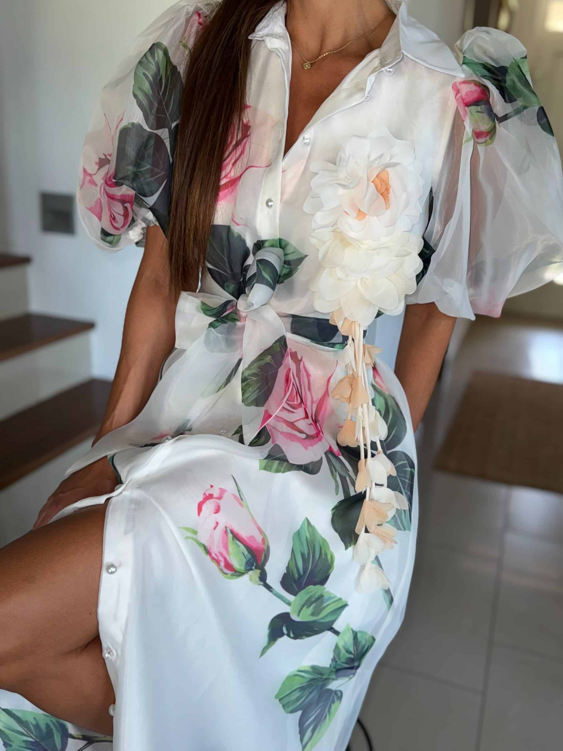 The Eternal Blossom maxi dress is a meeting of romance and sophistication. Its airy, translucent fabric and rosy pattern give it a truly feminine look, while the puff sleeves and buttoned fit add a special character. The classic white base and vibrant roses exude timeless elegance.