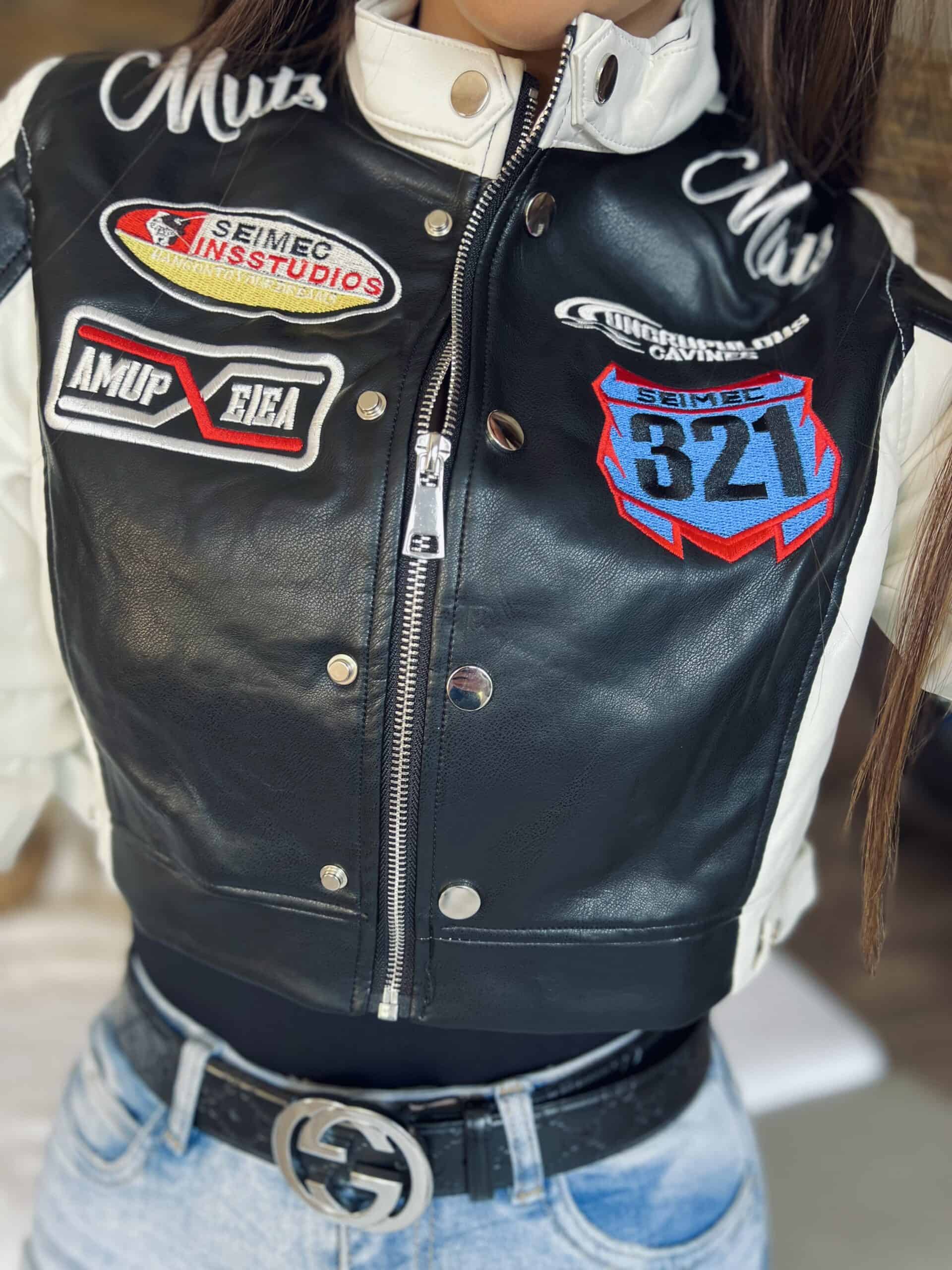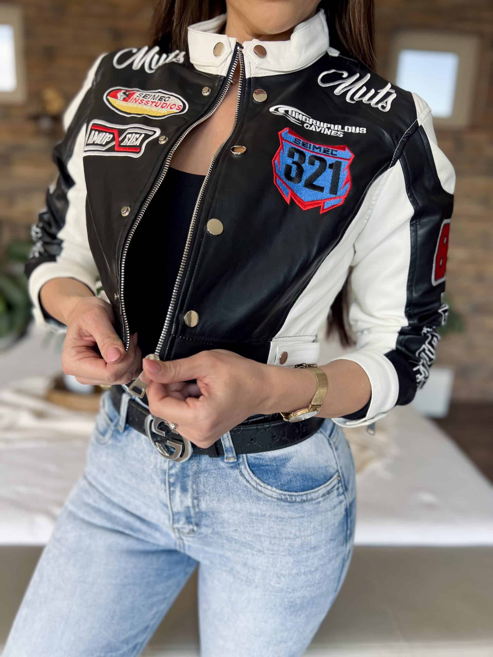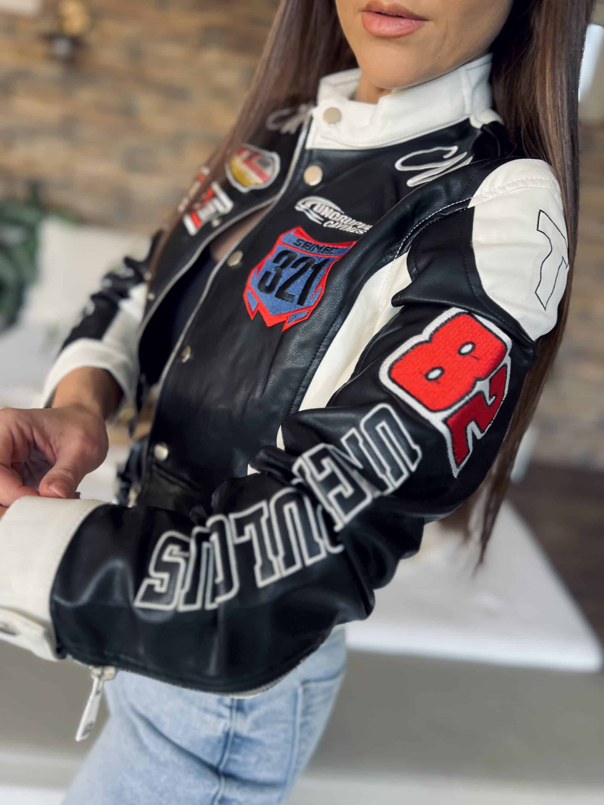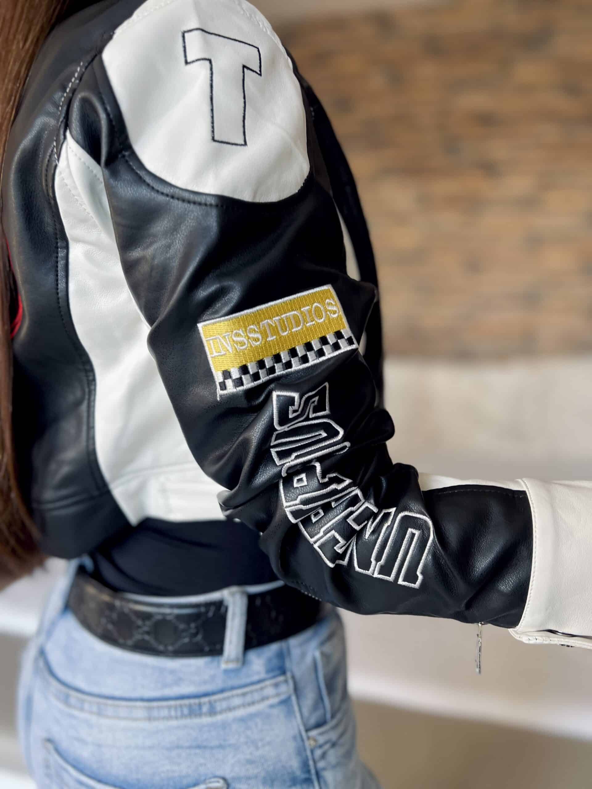 Black/white leather-effect short-waisted jacket with embroidered lettering and patterns