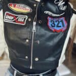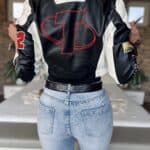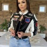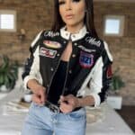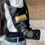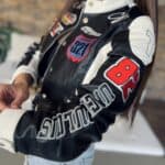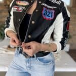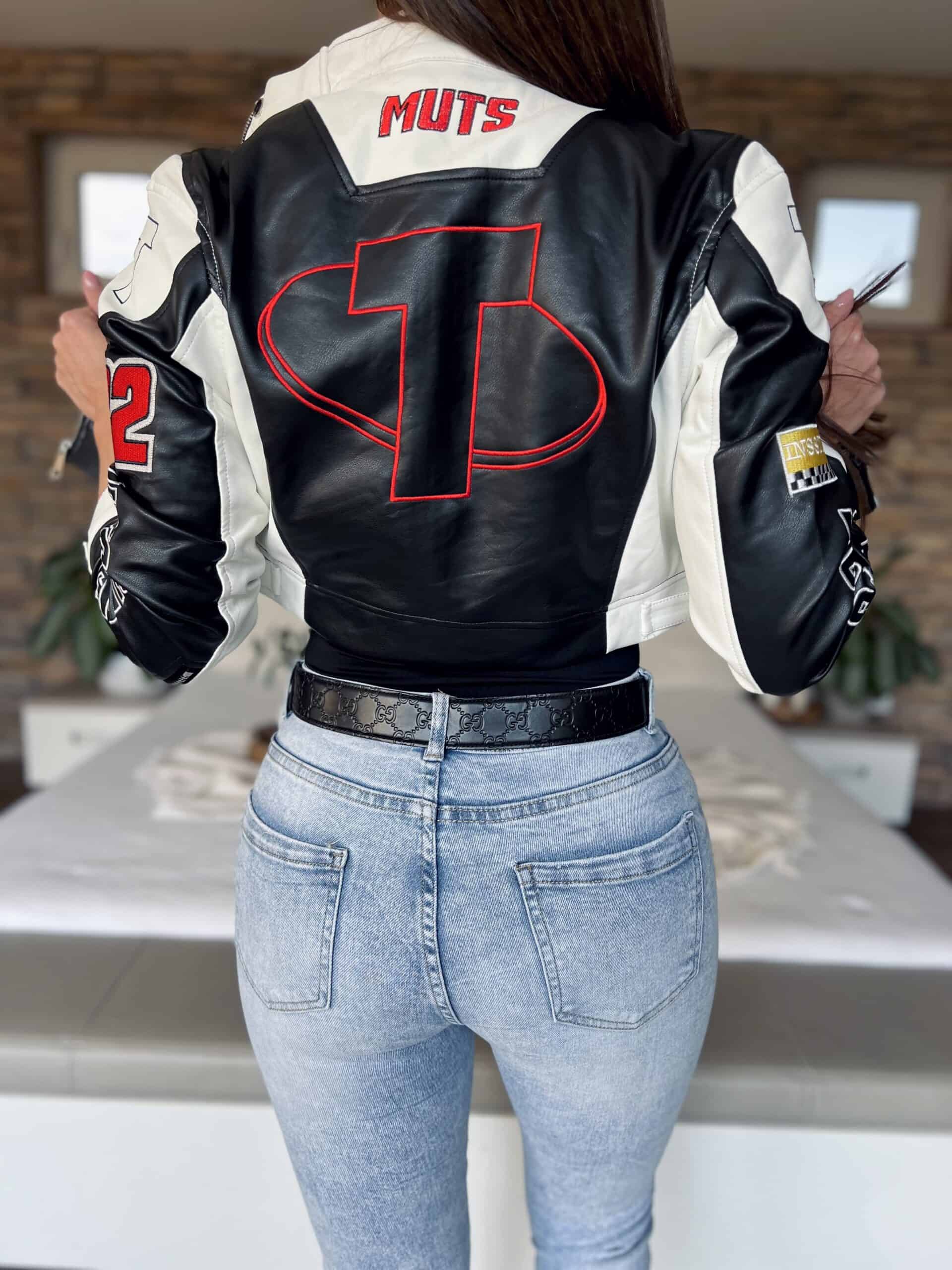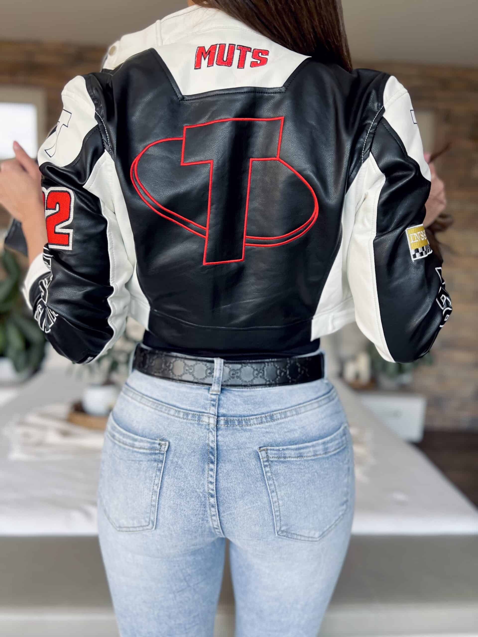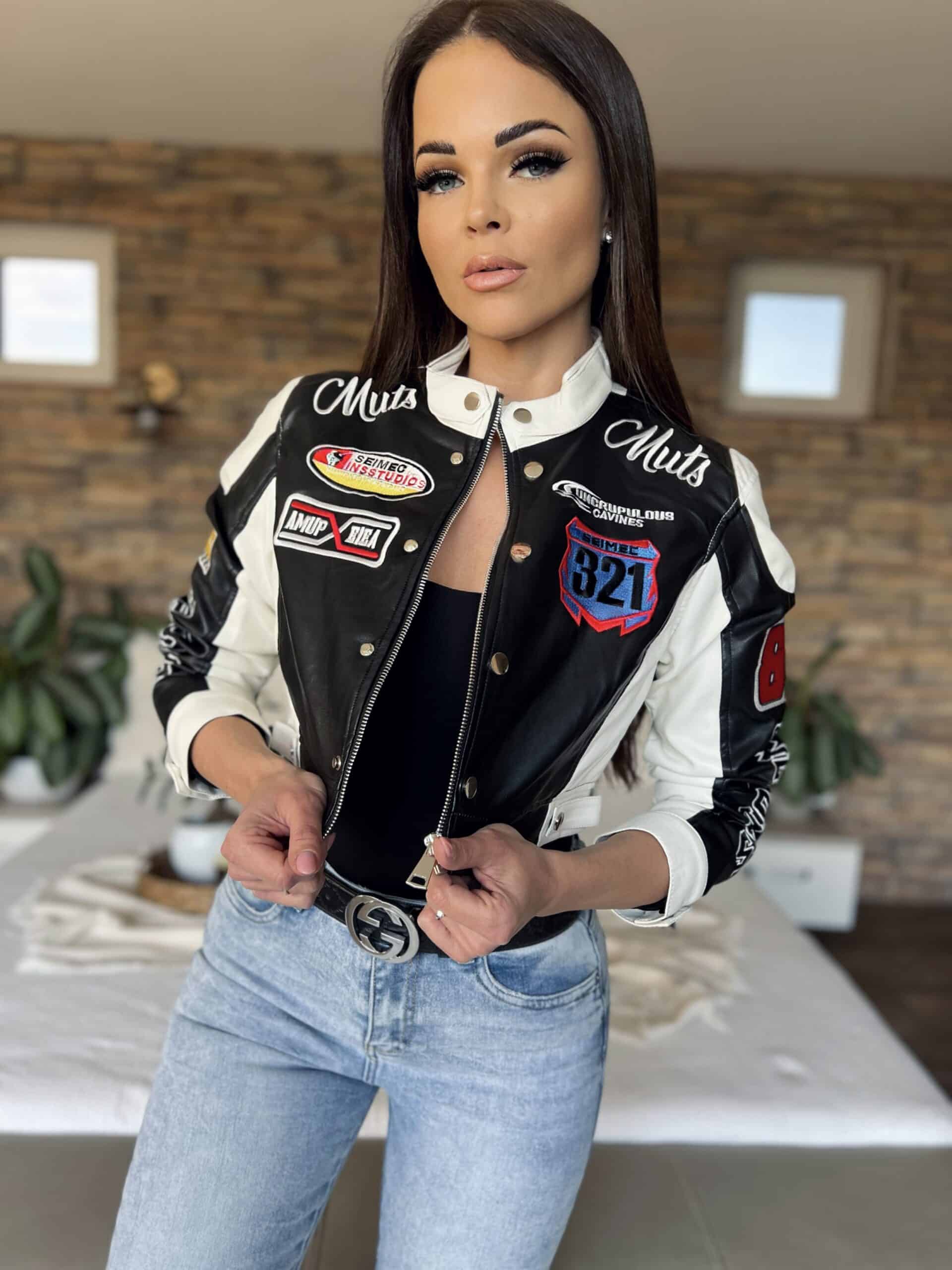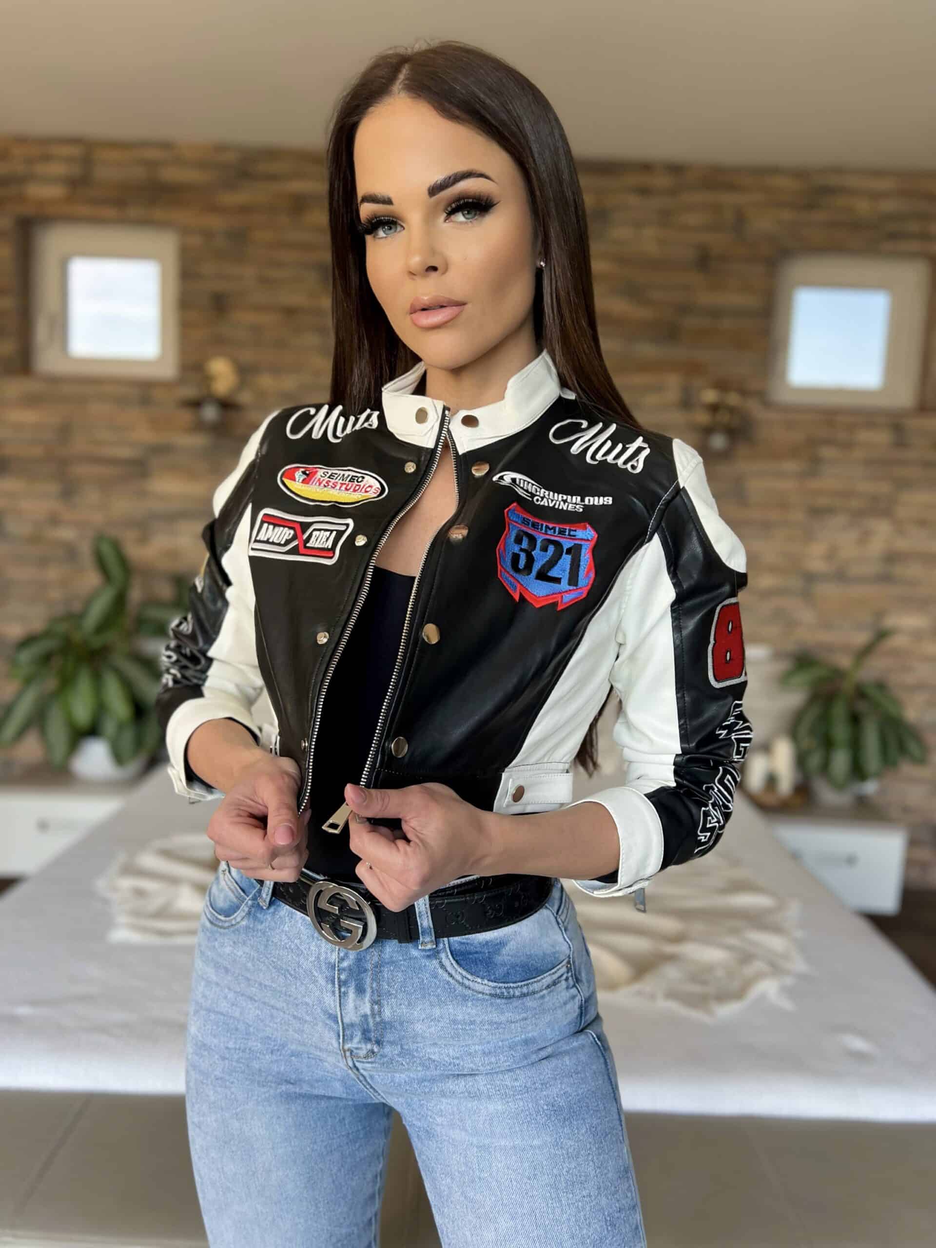 Black/white leather-effect short-waisted jacket with embroidered lettering and patterns