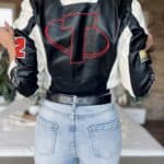 Black/white leather-effect short-waisted jacket with embroidered lettering and patterns: