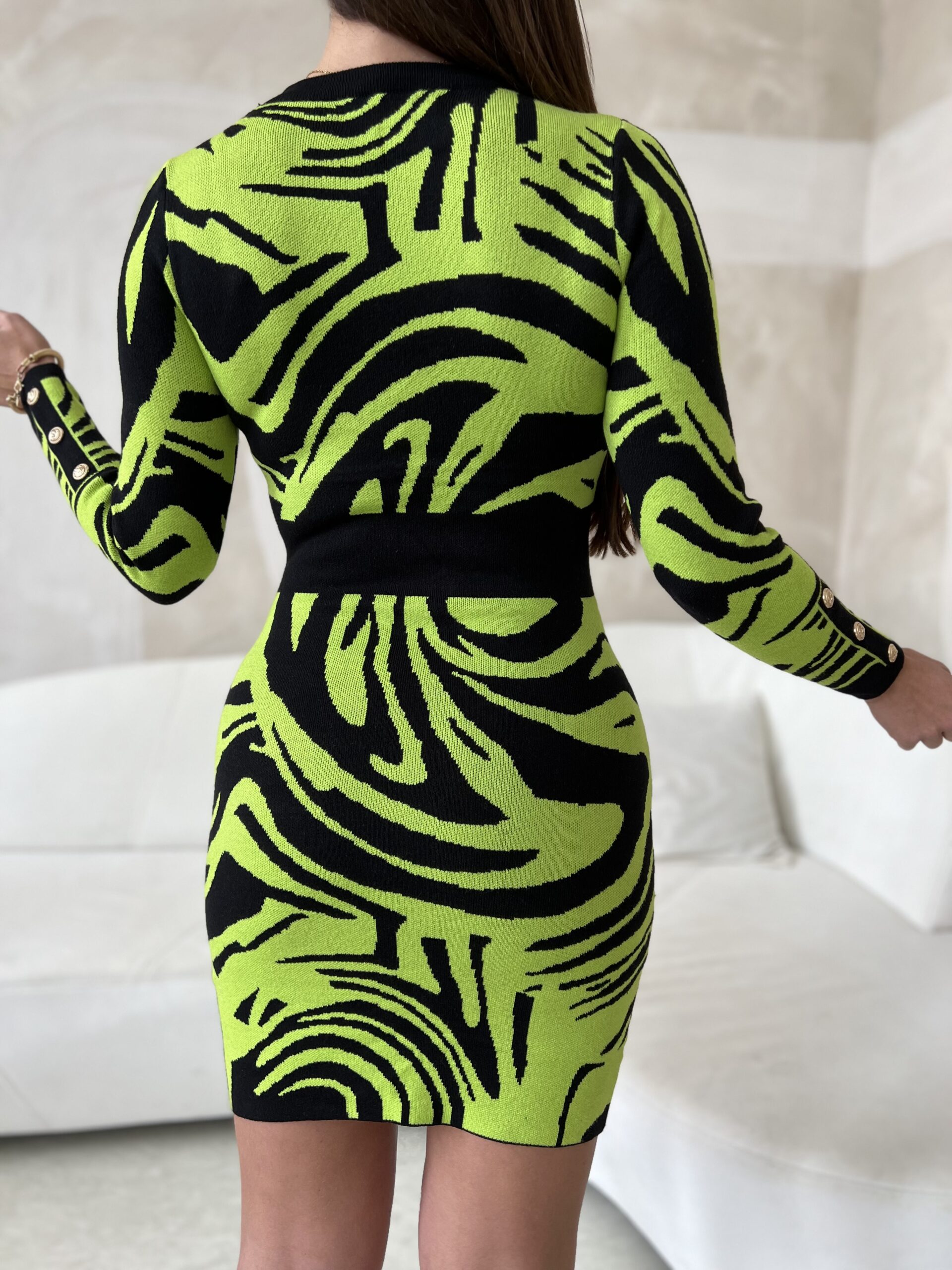Neon green knitted dress with black zebra print on a neon green background, with gold decorative buttons: