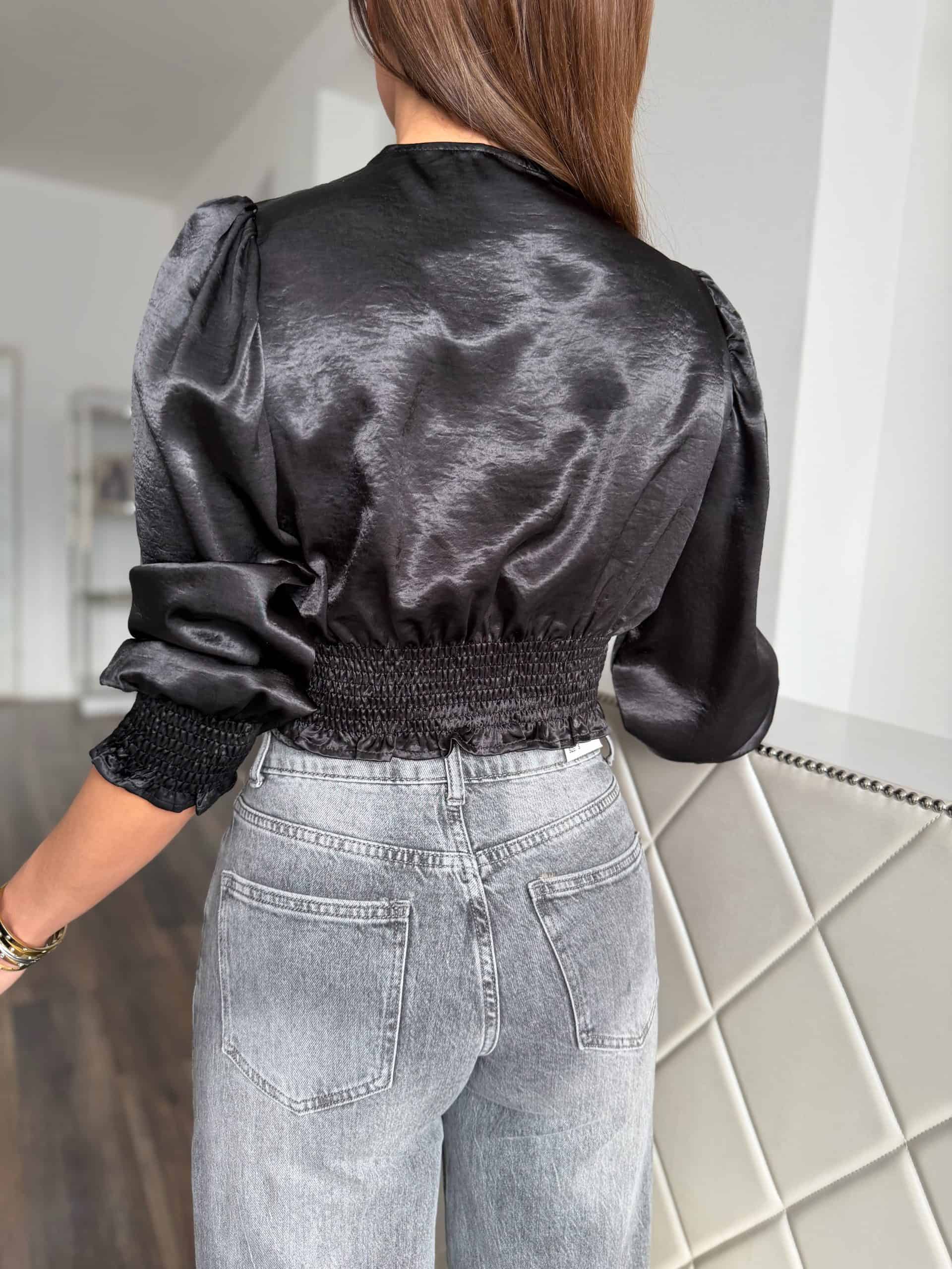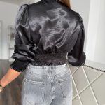 Shiny black crop top decorated with rhinestones: