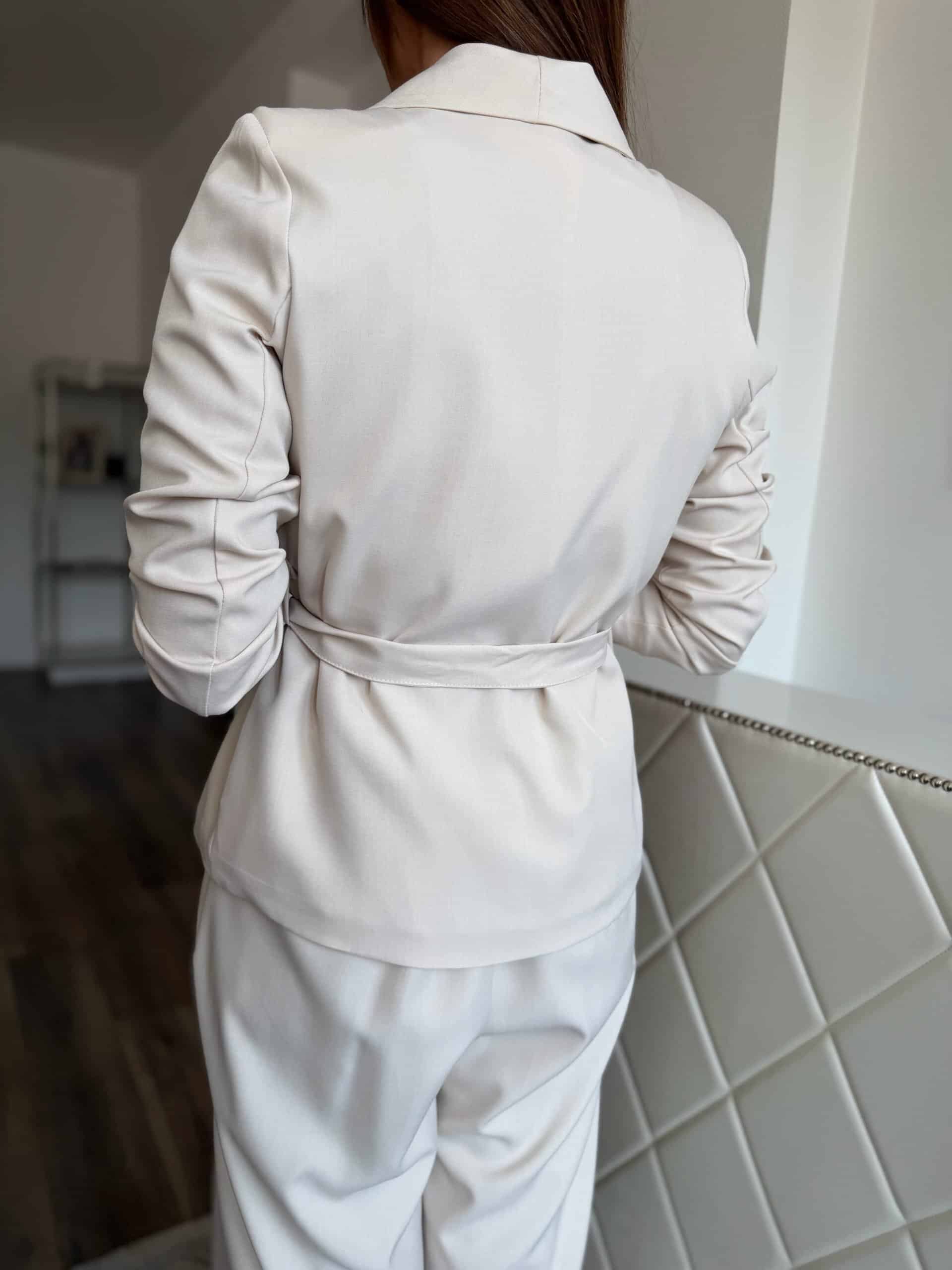 Soft, creamy beige blazer and long trouser set: