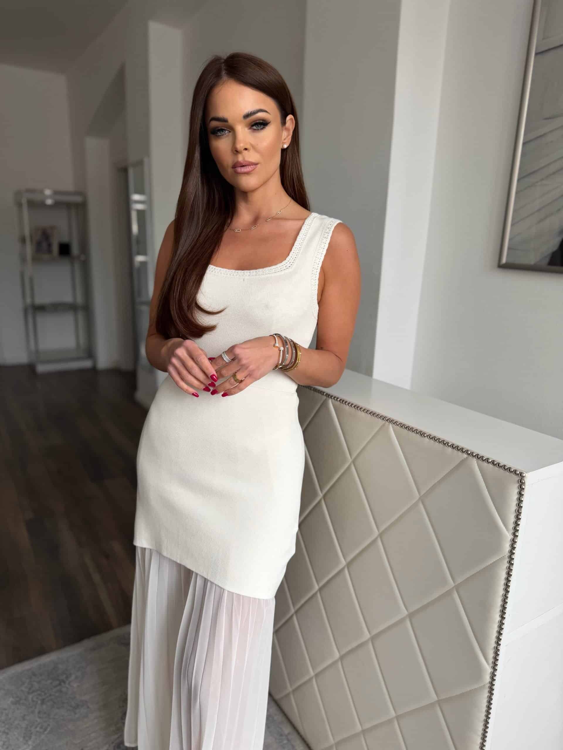 A creamy, warm-toned off-white plissé dress: