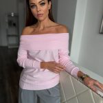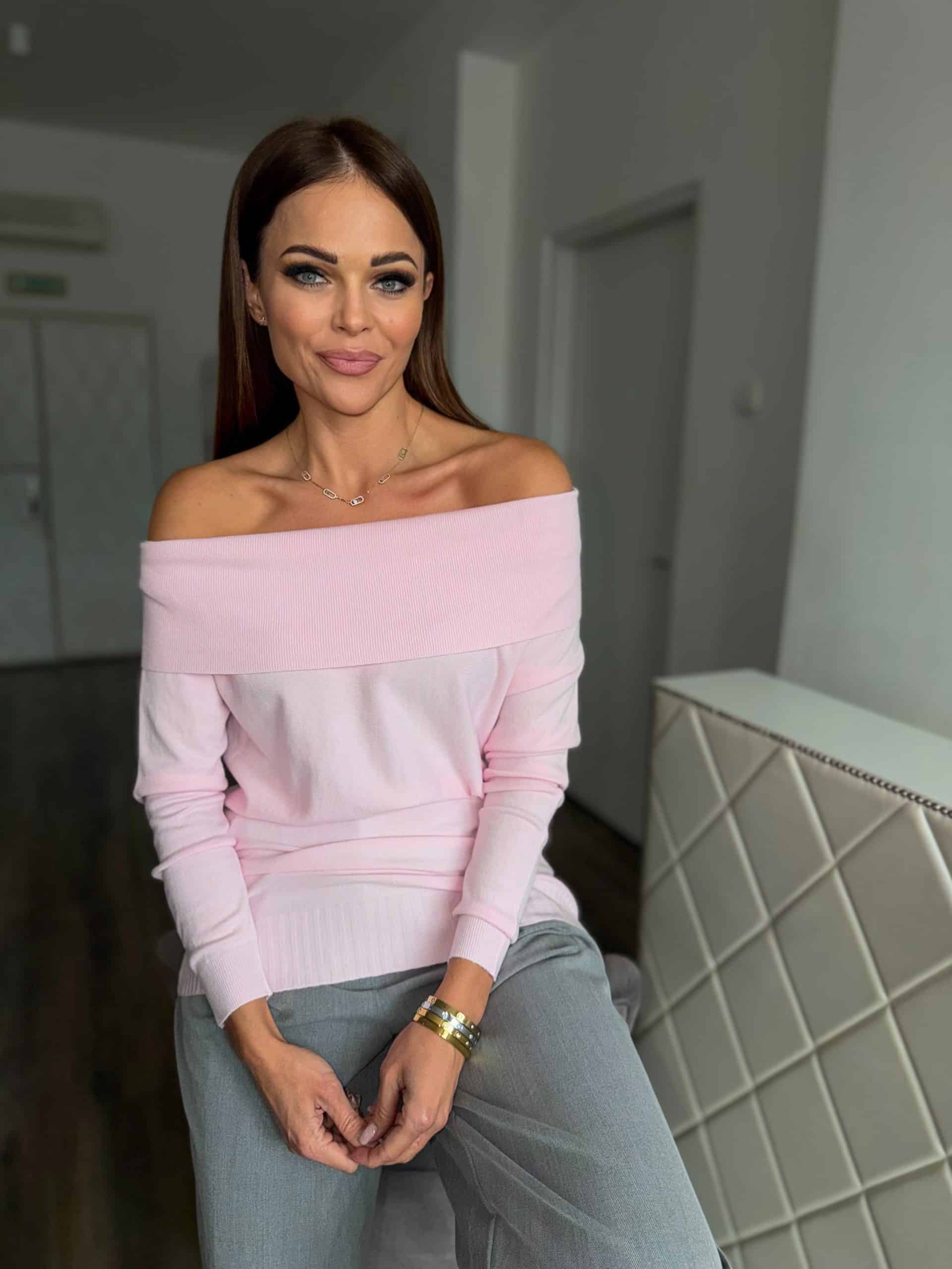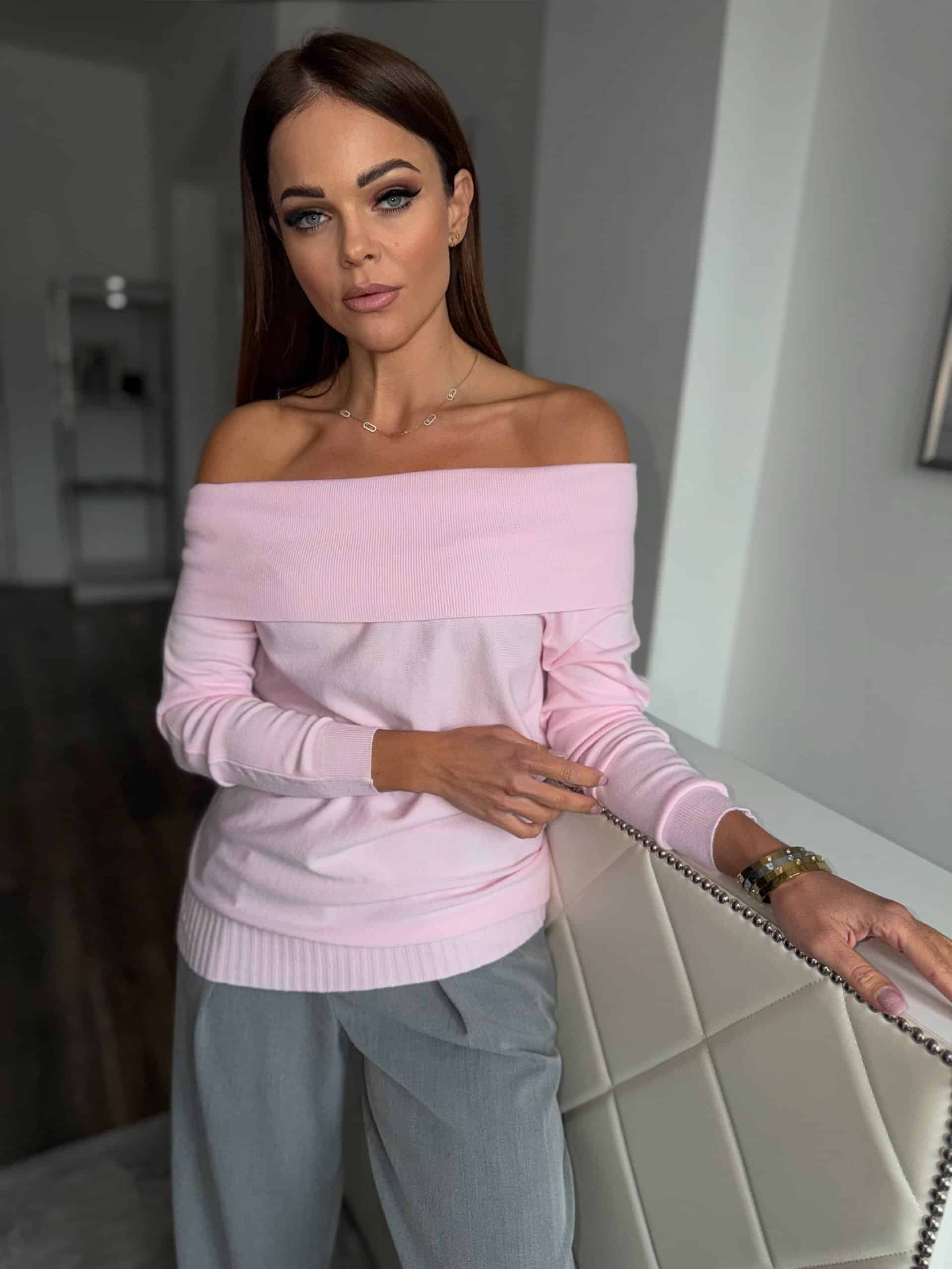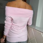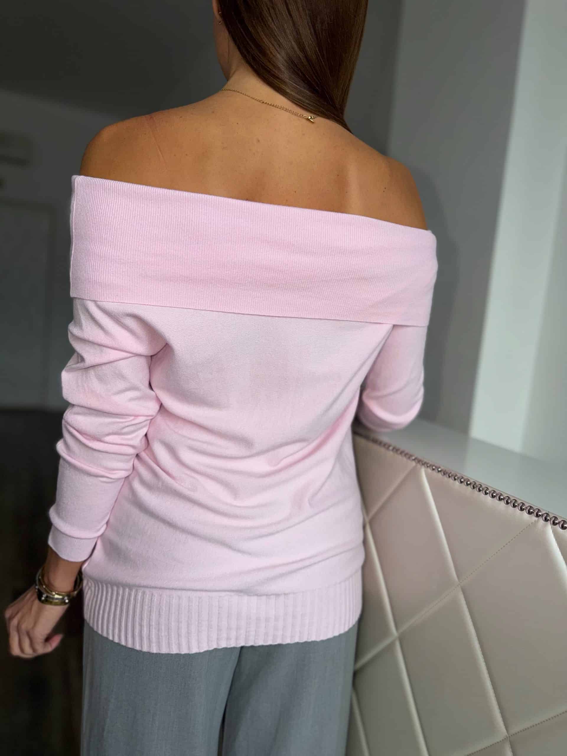 Fresh, springy pink, off-shoulder style sweater: