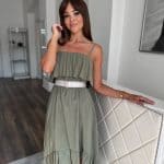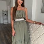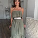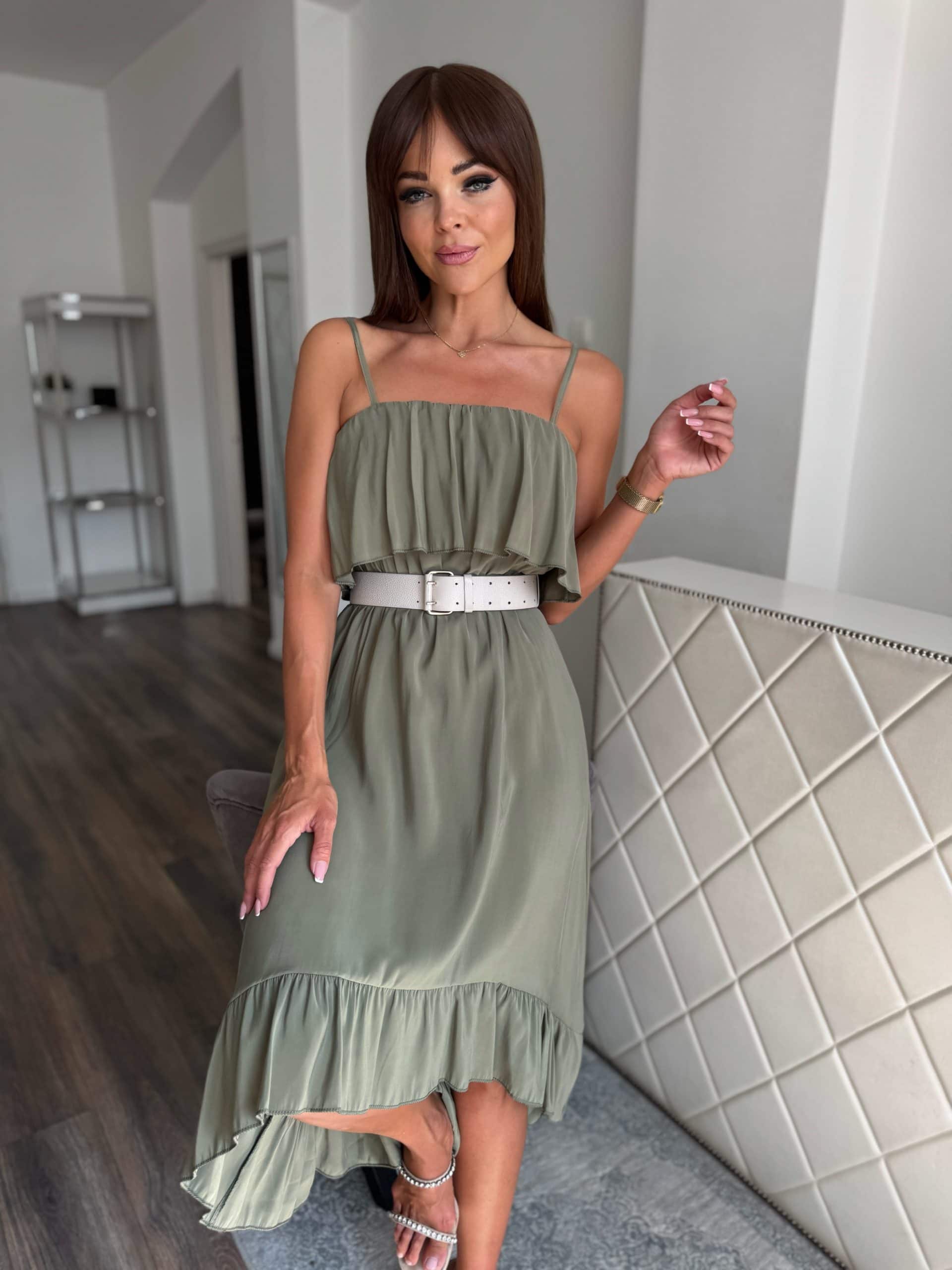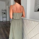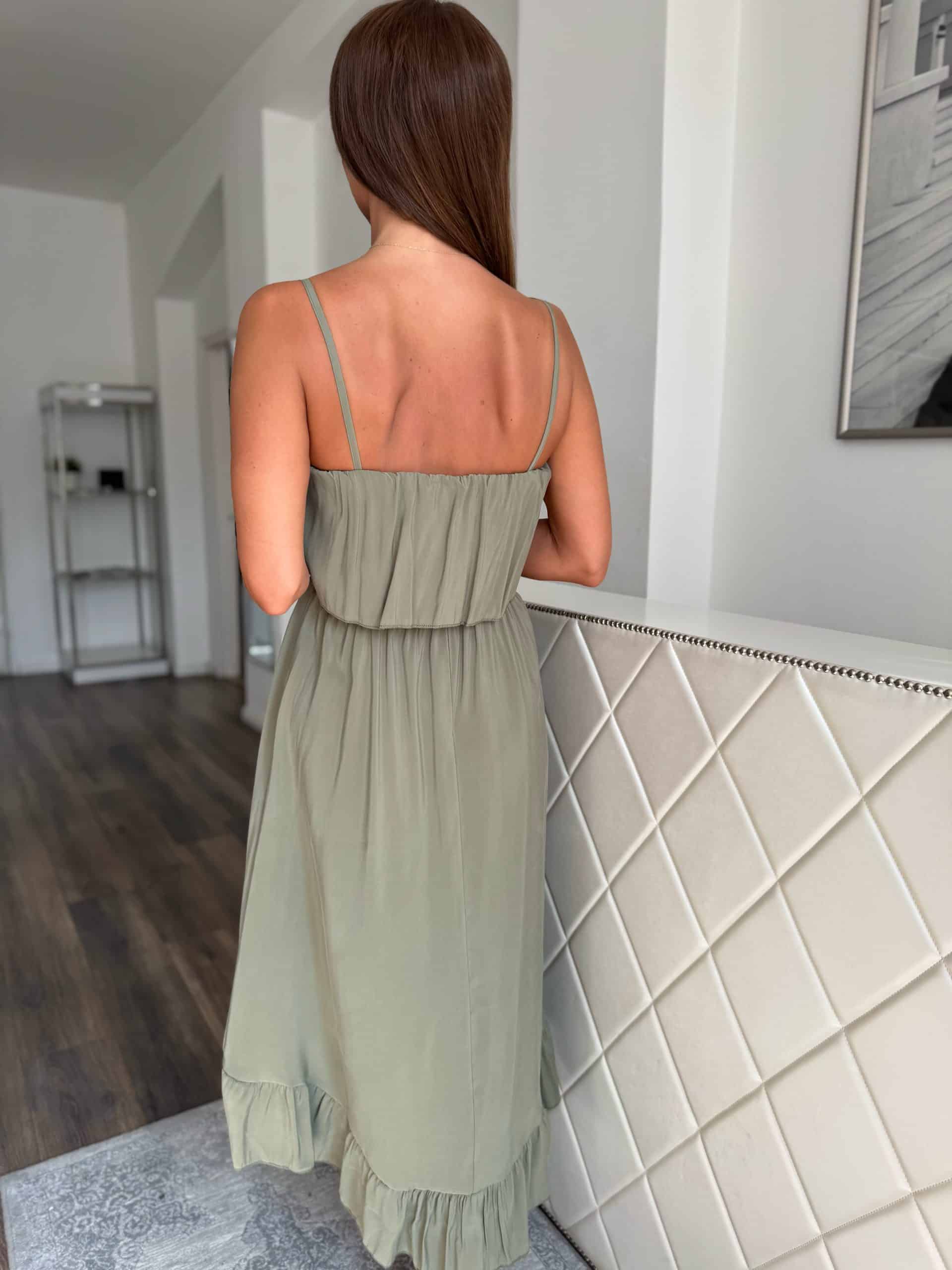 Khaki green front shorter back long dress: